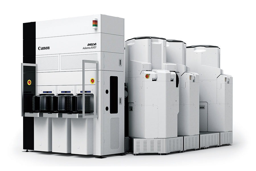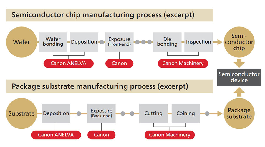 Canon contributes to many of the semiconductor production processes. For the lithography process, Canon's lithography equipment is used worldwide for mass production of power devices, for which demand is growing, and other semiconductors. The Industrial Group also offers nanoimprint technology for the production of superfine circuit patterns. For the film deposition process, it manufactures sputtering equipment that forms thin metal films, and for the chip bonding process, it manufactures die bonders that handle semiconductor chips. For high-performance packaging processes, which involve stacking multiple semiconductor chips or integrating chips with multiple functions, Canon enables larger chip integrations with its connecting lithography technology, which supports the soaring semiconductor production for AI applications.