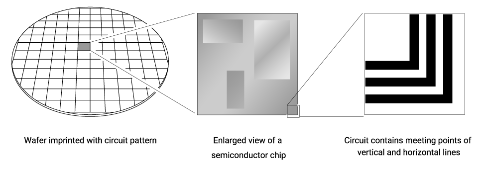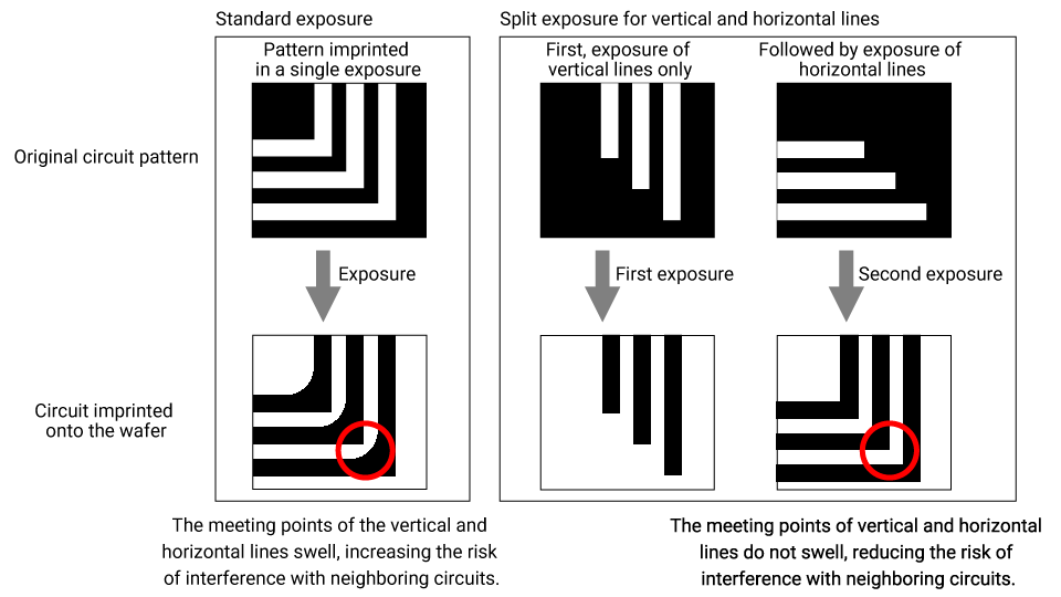 In the chip manufacturer’s production line, to improve the precision of the shape of junctions where vertical and horizontal lines meet at right angles, they performed separate exposures for vertical lines and horizontal lines instead of exposing them simultaneously.