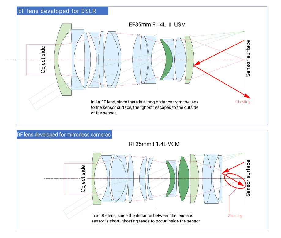 The short back focus used in RF lenses may appear to have no downsides. However, because the image sensor and lens are positioned close together, one unfortunate outcome is the frequent occurrence of “ghosting.” *1