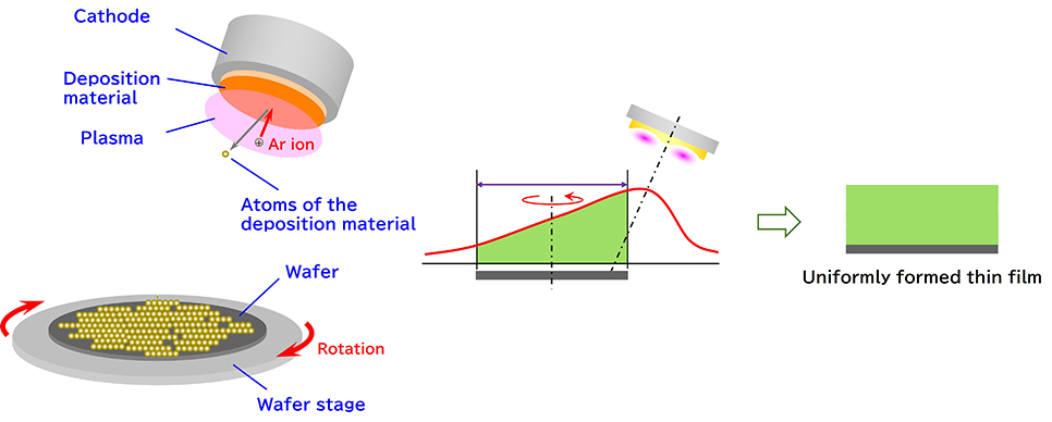 Oblique sputtering with rotating substrate is a technique in which the cathode electrode that generates plasma is positioned at an angle to the wafer