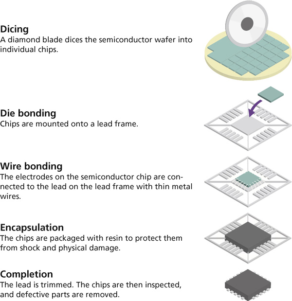 The manufacturing process of semiconductor chips is divided into two stages: the front-end process, where electronic circuit patterns are formed on a wafer, and the back-end process, where the patterned wafer is cut into individual chips and assembled to function properly within electronic devices.