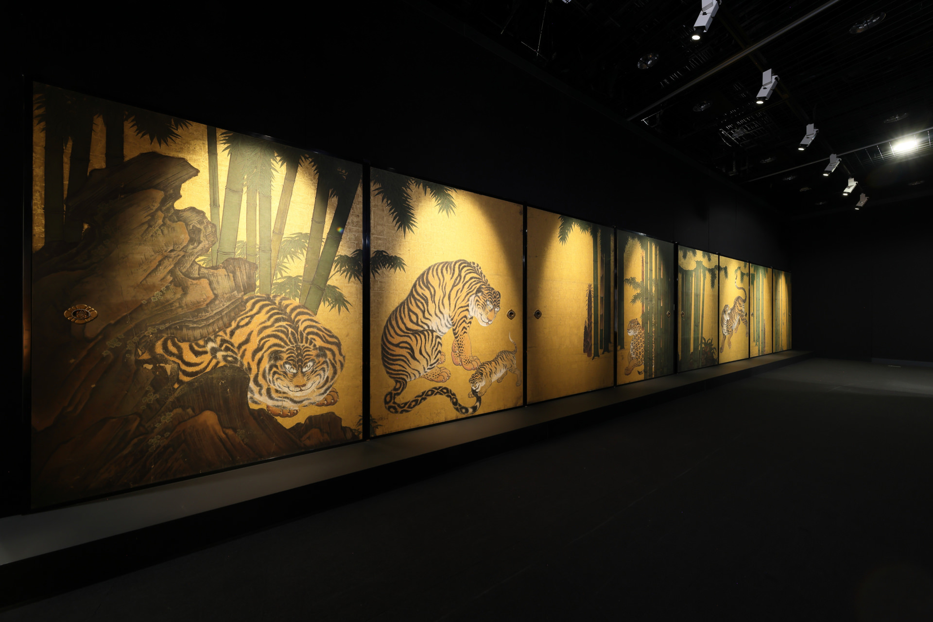 Behind “Dragon and Clouds” was “Tigers in Bamboo Grove” by Kano Sanraku and Sansetsu. These tiger and bamboo motifs are painted over gold foil in this exquisite work.