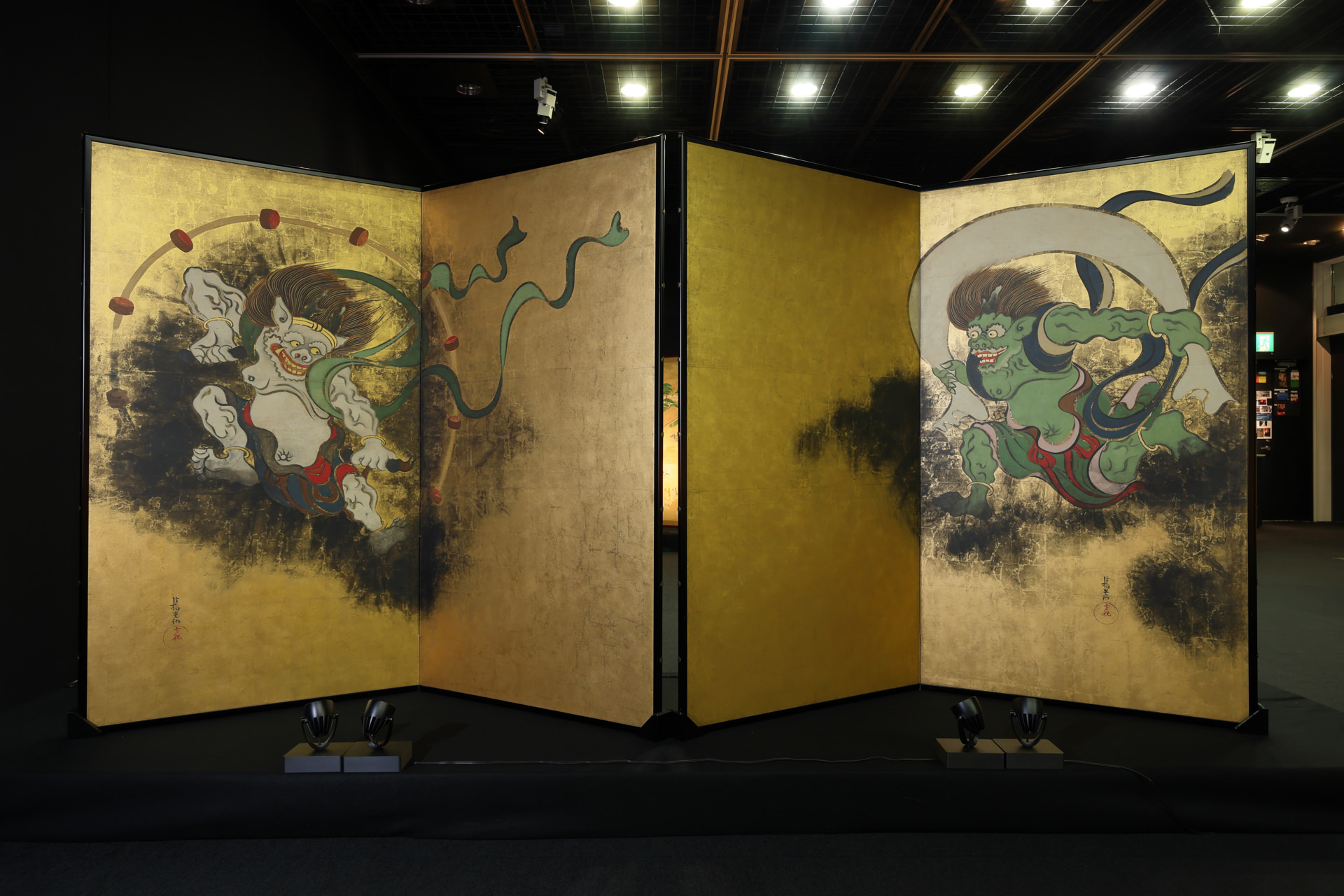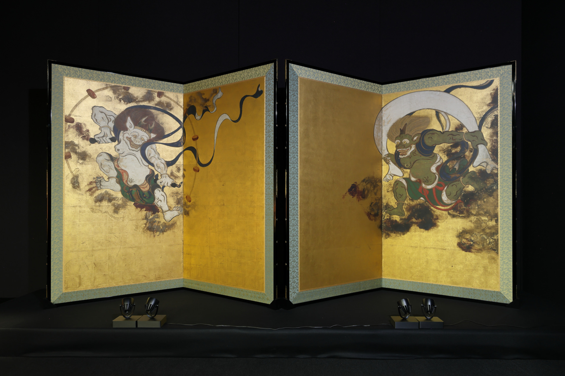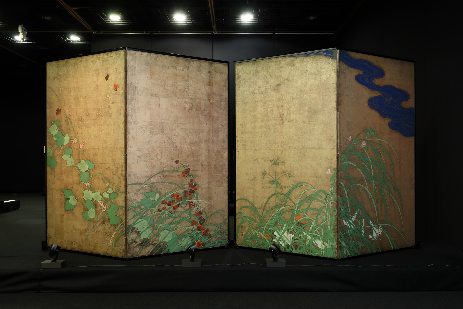 *“The Wind and Thunder Gods” (by Ogata Korin) and “Flowering Plants of Summer and Autumn” (by Sakai Hoitsu) are now finished on separate folding screens for preservation purposes, but the facsimile has one on each side, as they used to be.