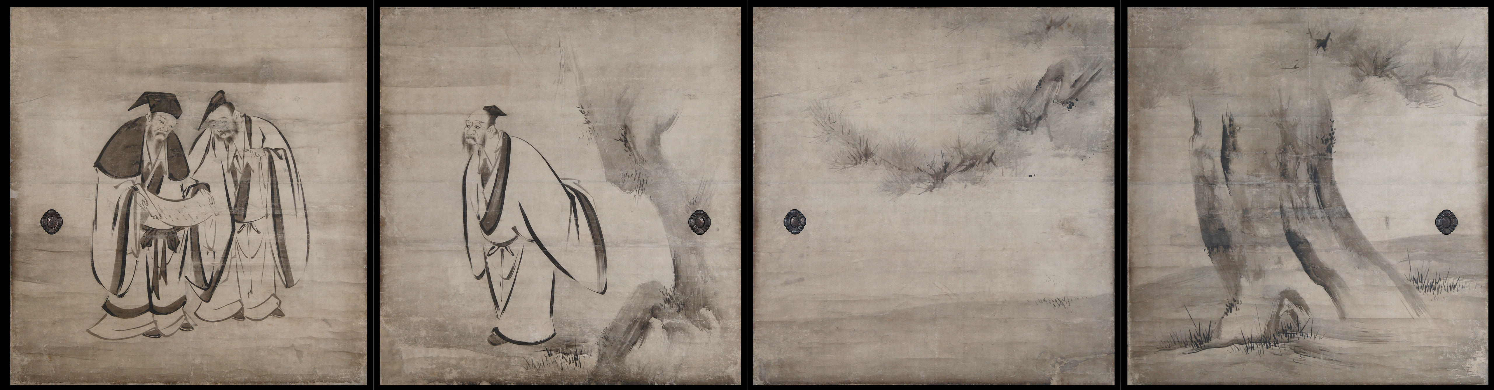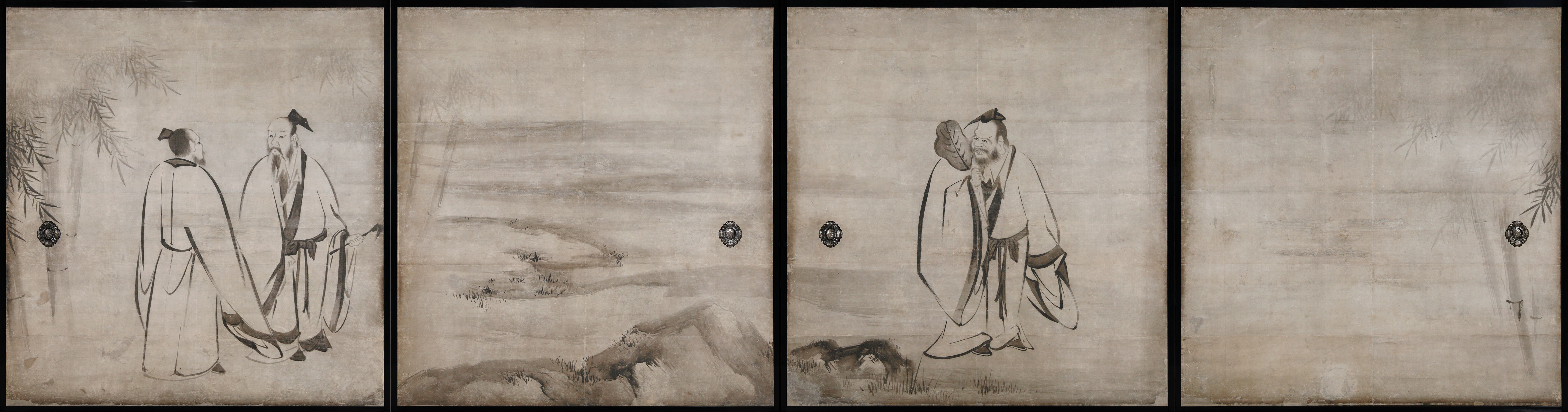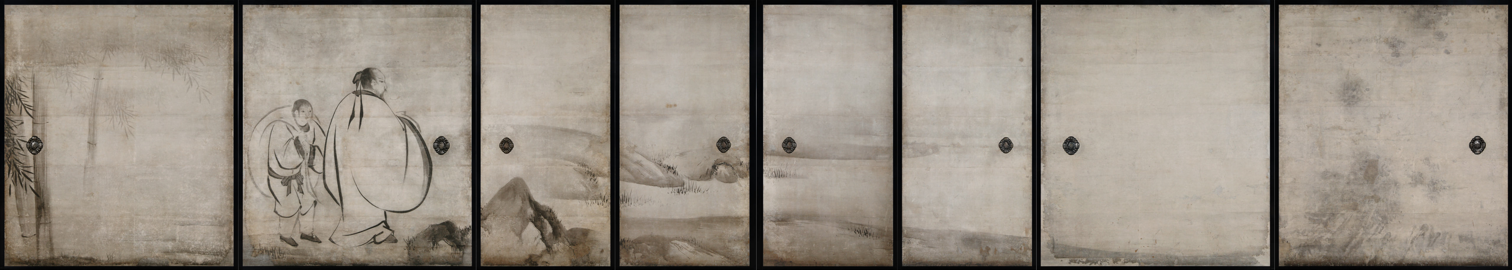 Among a collection of 50 panels of the Abbot‘s Chambers at Kenninji Temple are 16 panels of images on sliding doors decorating an inner room. They were painted by Kaiho Yusho, who was involved in a revival of Kenninji Temple in the early modern era. The "Seven Sages in a Bamboo Grove" depicts the seven sages in a bamboo thicket drinking wine, playing music, and indulging in noble and refined discussion (which transcends this world), having escaped the national crisis of Wei Jin era (mid-3rd century) in China. It is believed they had been critical of politics driven by the Sima clan, who were in power at that time, and their Confucian morals (with restrictions on freedom of speech). This free-spirited behavior won great support in the ensuing years. Kaiho Yusho specialized in portraits of people wearing loose and baggy clothing that appears to billow in the wind; these were known as fukuro-e (bag) style paintings. The “Seven Sages in a Bamboo Grove” is typical of his work.