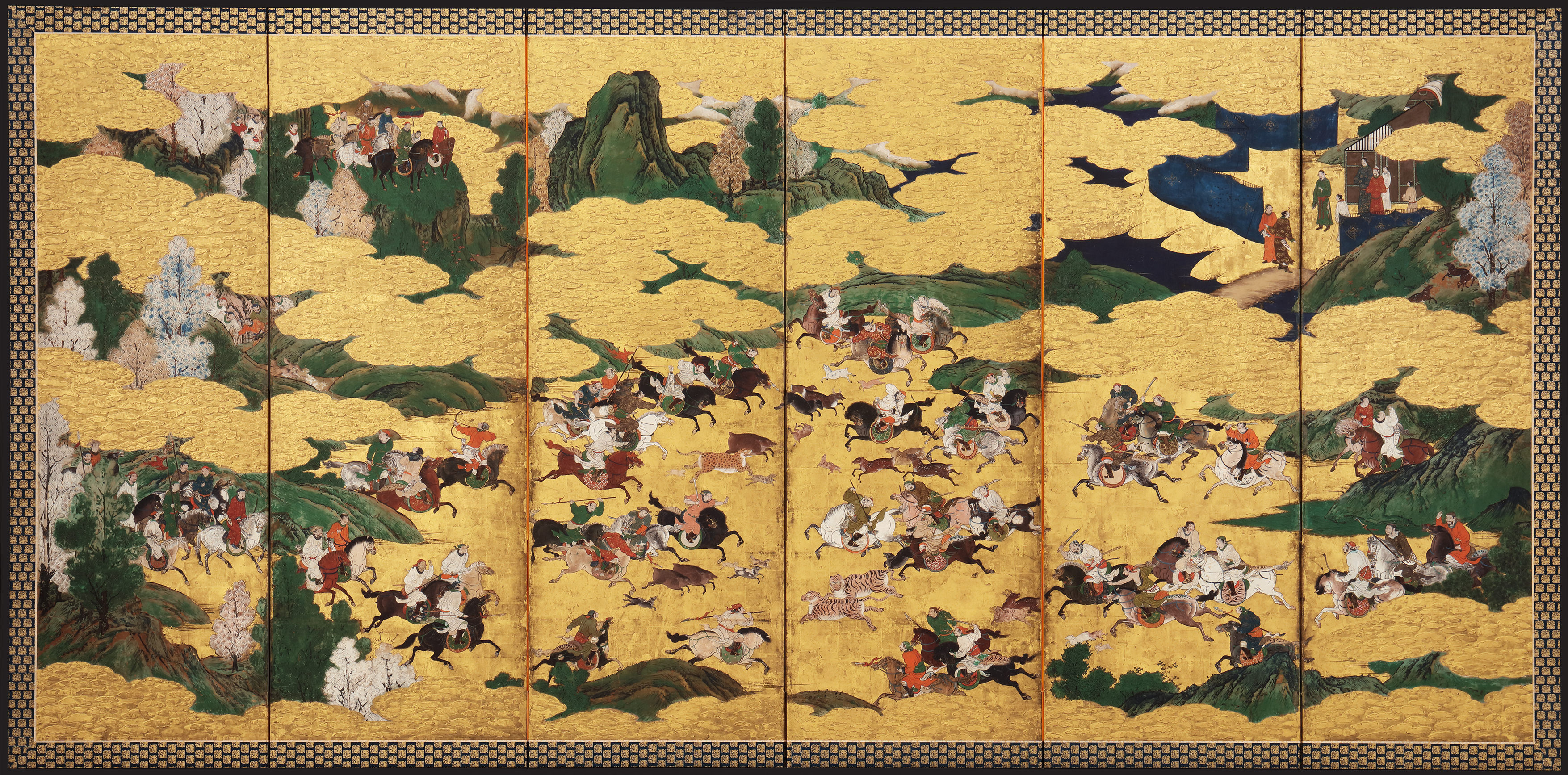 Tatars playing polo and hunting, attributed to Kano Soshu (Japanese, 1551–1601). Ink, colors and gold on paper. Asian Art Museum of San Francisco, Museum purchase, B69D18.a-.b. Photograph © Asian Art Museum of San Francisco.