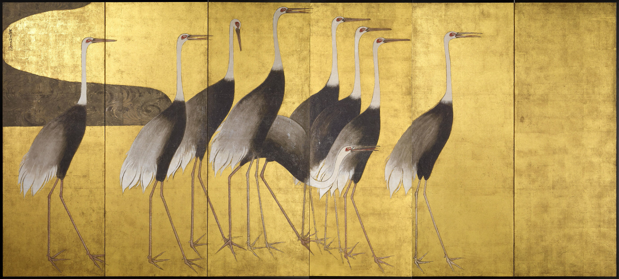 This bold composition presents a grouping of black and white cranes extending to the left and right across a gold background. It is the work of Ogata Korin, a painter representative of the Edo period who created his own world with innovative compositions and graceful depictions. The 19 cranes in this work, grouped in a rhythmic arrangement, are walking in a stylized manner toward the center of the folding screen. Stylized swirling waves at both ends of the screen create a unique sense of space. Korin was born to the family who operated the wealthy drapery store "Kariganeya" in Kyoto, where he began painting full-time in his 40s. Korin represented the Rimpa School, with its rich decorative style that flourished during the Edo Period. In later years, Sakai Hoitsu and Suzuki Kiitsu drew with a similar sense of composition and demonstrated the flow of the Rimpa School.