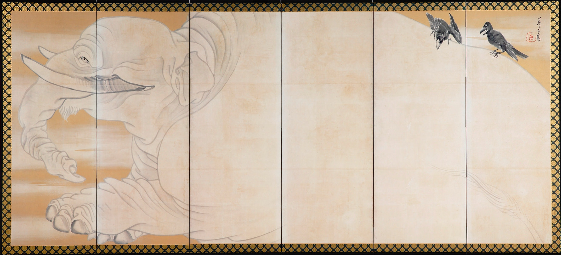 This is a masterpiece of Nagasawa Rosetsu, who has gained popularity in recent years as an eccentric painter with similarities to Ito Jakuchu and Soga Shohaku. Rosetsu was born to a samurai family in Kyoto and studied under Maruyama Okyo, a leading Edo-period painter. He revealed his talent early on and performed brilliantly as a senior disciple of Okyo. The bull and elephant in this work reflect the outstanding technique of the Maruyama school, which emphasizes reality. However, Rosetsu's wit is even more appealing. The bold composition of the white elephant and the black bull, which are so large they almost seem burst from the pair of six-fold screens, fully reflects Rosetsu's sense of beauty, which has remained fresh for more than 200 years. The same can be said of the exquisite contrast between large and small and black and white evident in the arrangement of the small black birds and white puppy that respectively emphasize the huge size of the elephant and bull.