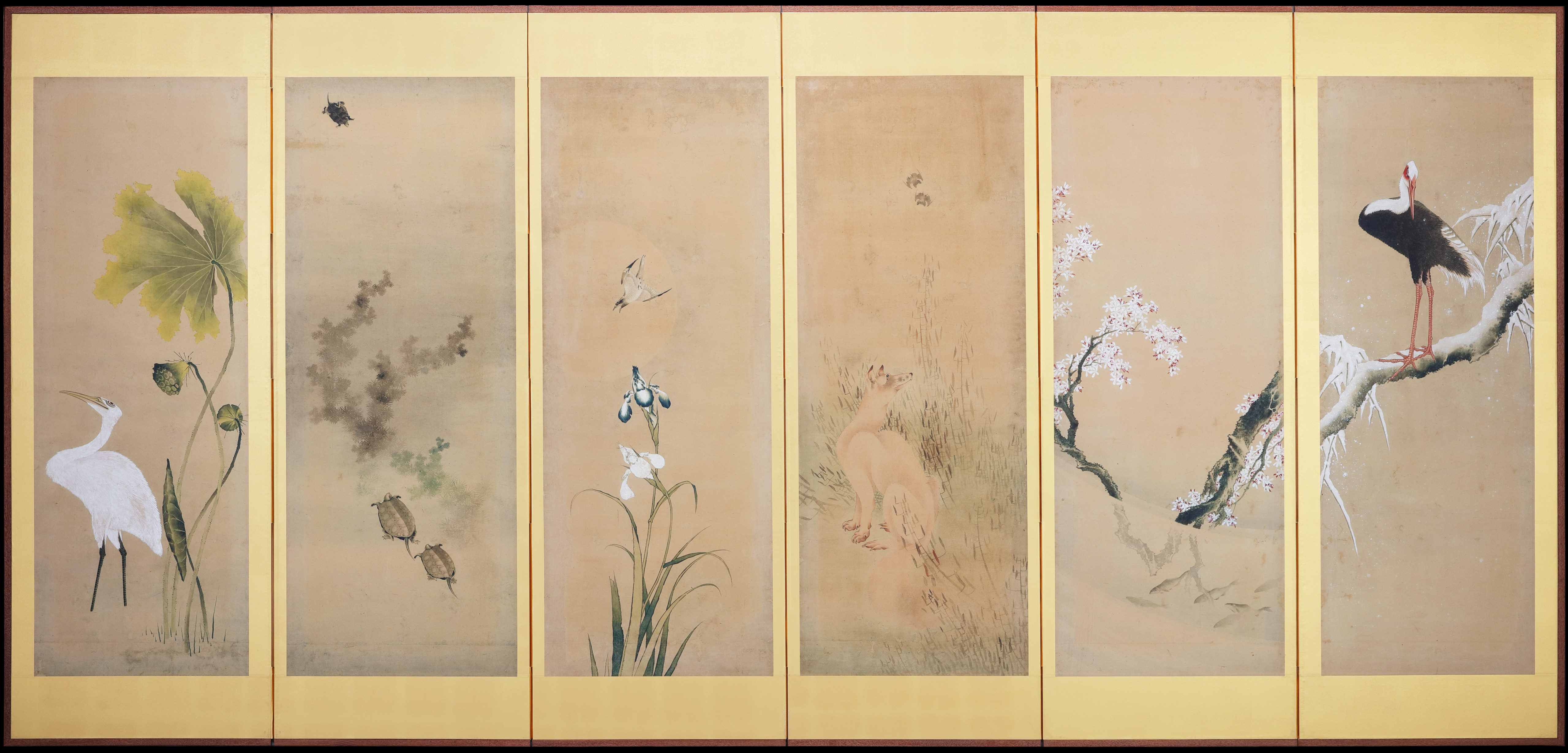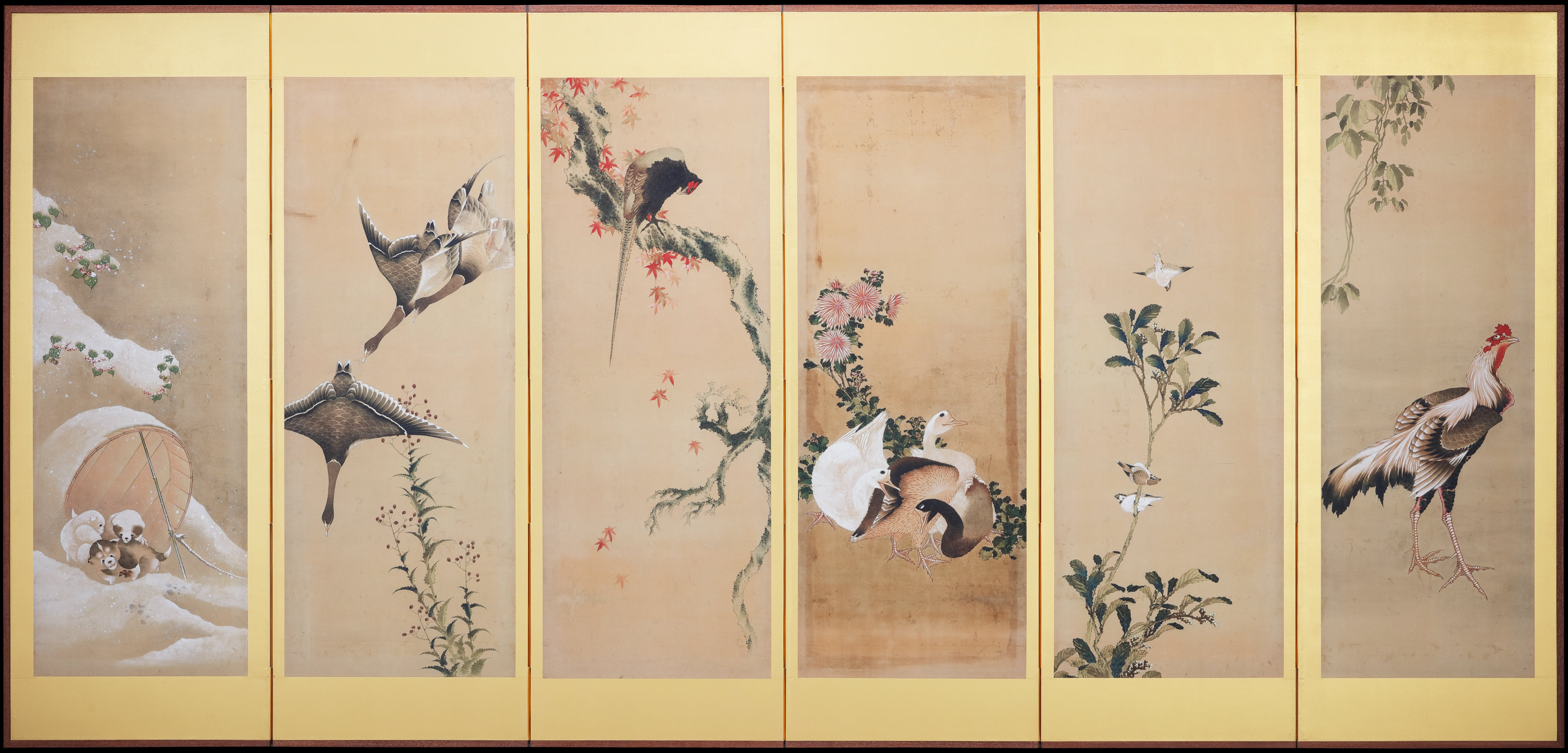 These 12 panels with Oshi-e bari (paintings mounted on screens) are composed of a pair of six-panel folding screens vividly depicting birds, animals, and plants of the four seasons. Although the title of the painting itself is based on the title of a collection of waka poems (Waka Poems on Birds and Flowers) by Fujiwara no Teika (1162–1241), a poet of the Heian period, the motifs of the months are independent of the then-standard patterns. Hokusai selected the motifs according to his own interpretations. Looking at each one beginning with the first panel of the row of panels on the right, we find a crane perched on a snowy willow, fish swimming in a pond with the sagging branches of a cherry dipping into it, a fox looking up at bats, a little cuckoo flying over irises, tortoises swimming through freshwater algae, and an egret standing by sacred lotuses. On the left-hand row of panels, beginning with the extreme right, we see a chicken looking up at a kudzu vine, buntings perched on a gardenia, chrysanthemums and geese, a pheasant perched on a red-leaved branch, wild geese flying down onto thistles, and lastly puppies playing with each other under a tub. This is one of the original paintings bought in 1904 by Charles Lang Freer, together with Six Tama Rivers and others, from Homma Kozo of the Homma family, who were wealthy merchants from Sakata, Yamagata Prefecture, via the Japanese fine art dealer Kobayashi Bunshichi.