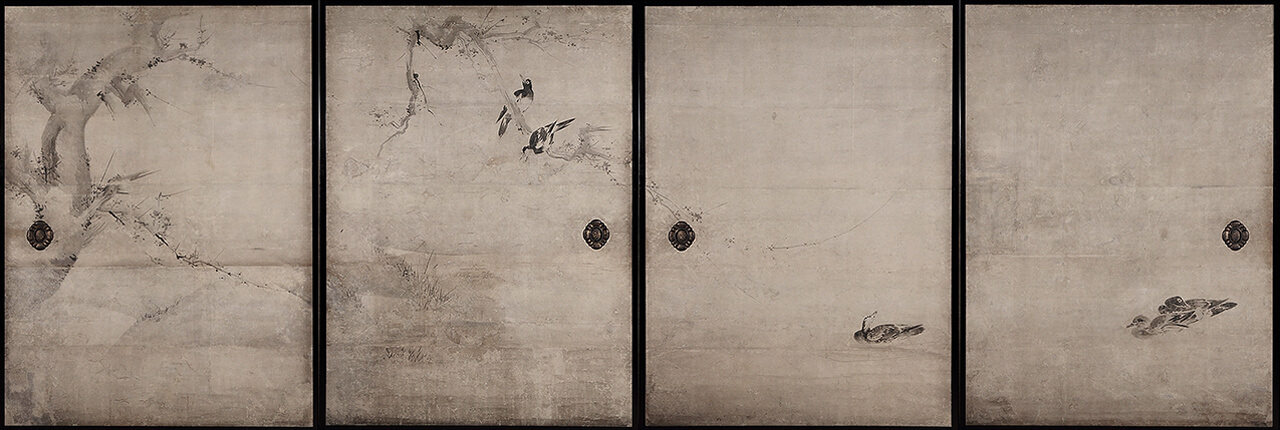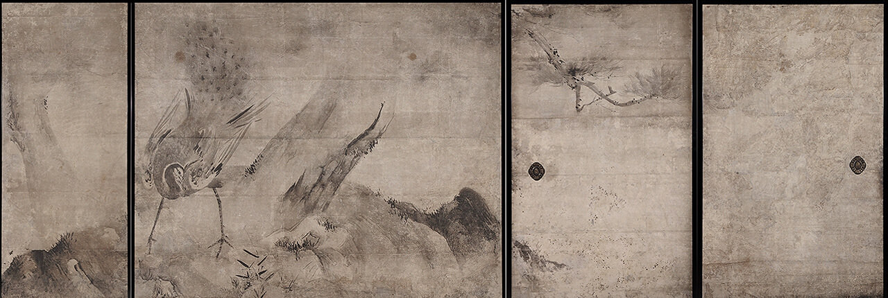 These eight sliding doors adorn the drawing room at Kenninji and are part of the 50 panels of the Wall and Screen Painting of Hojo hall of Kenninji (an important cultural property) painted by Kaiho Yusho. Yusho painted these doors, which are regarded as Japan‘s most renowned series of ink and water paintings, as part of the restoration work of Kenninji during the early modern era. The two large and small wall panels affixed to the west side and the two sliding doors feature two pine trees sprouting from the bulging ground beneath it where a peacock stands, seemingly poised to take off into the air. The four sliding doors on the south side form a continuous composition portraying a pair of crested myna perching on a plum tree showing a touch of spring, and three waterbirds swimming in a lake.