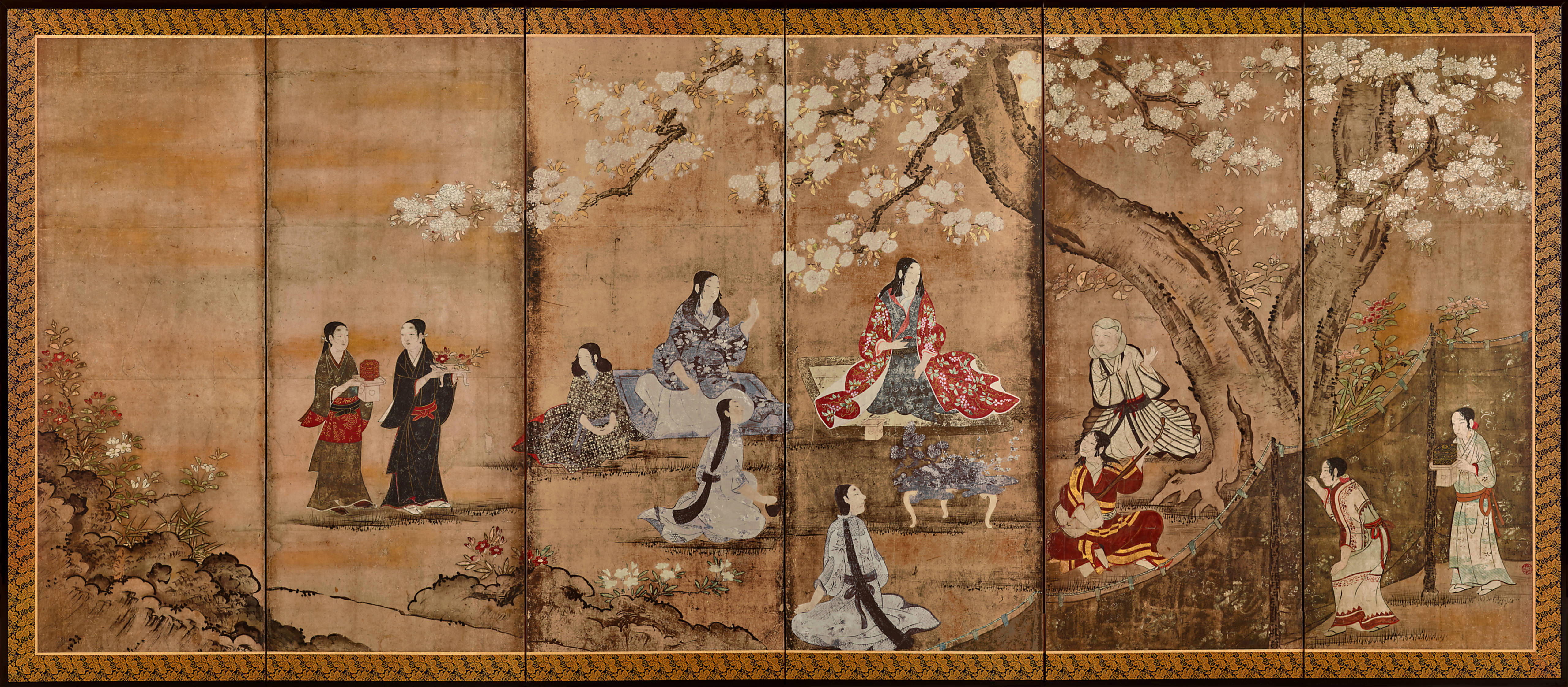 These folding screens depict a scene of cherry blossom viewing from around 400 years ago, when the Azuchi-Momoyama period was drawing to a close and the Edo period was just beginning. A spring party unfurls across a space partitioned off by large curtains. The right-hand screen depicts double-flowered cherry trees in full bloom. Some ladies sit around culinary treats under these trees. We can almost hear the hand-clapping and cheerful singing that accompanies the sounds of the shamisen. This is what an outdoor get-together of women probably looked like about 400 years ago. On the left-hand screen, several people sit on the veranda of an octagonal structure beneath the white blossoms of aronia trees. They gaze down on the dancing figures below. We can also see a waiting palanquin bearer dozing beneath the veranda. The central figure at the party must be someone of fairly high social standing. The protagonist is actually the child on the veranda wearing a red kimono and holding a fan. Women dance playfully before her eyes. The beauties in the center are garbed in the latest fashions of the day. Their eyes are sharply outlined and a closer look reveals black pupils inside the deep brown of the irises, while light black ink has been applied to the inner and outer corners of the eyes to give them a three-dimensional aspect. The women on the right are dressed as men, complete with swords hung around their waists. They are probably performing a fashionable dance known as Okuni Kabuki. The depiction of the dancer with the sole of her foot on display almost seems like a work of stop motion animation. The women on the veranda have also kicked their feet up, as if swept away by the rhythm. The painting presents a snapshot of people enjoying the cherry blossoms. It splendidly captures the Japanese love of the seasons and joyful appreciation of spring. This powerful work entrances the modern-day viewer and makes us want to sing and dance, too. Unfortunately, the two center panels of the right-hand screen were destroyed during the Great Kanto Earthquake in 1923. Nowadays, the painting in its entirety can only be seen through black-and-white photographs.