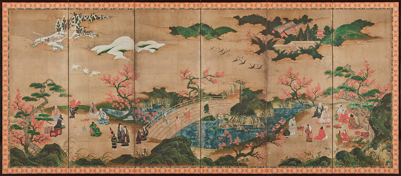 This painting depicts people enjoying themselves while viewing the foliage beside Kiyotaki River in Takao, an area north of Kyoto famed for its beautiful autumn foliage. On the screens to your right, women with children relax by the river and view the autumn leaves while drinking sake or tea made by a tea vendor. Two men play flutes on the bridge in the center. A Buddhist priest and a young apprentice chat away as they prepare to cross the bridge. On the left, men sit in a circle and sing and dance as they enjoy a sake party. In the distance, from the clouds that float in the mid-section of the screen, the pagoda of Jingoji temple peeks out on the right. The gate and approach to Atago shrine appear through the clouds on the left. They are covered in snow, as if to announce the onset of winter. This painting vividly portrays the clothes, food, and forms of entertainment enjoyed by people of the time. We hope you enjoy these scenes of people merrymaking alongside the beautiful autumn foliage.
