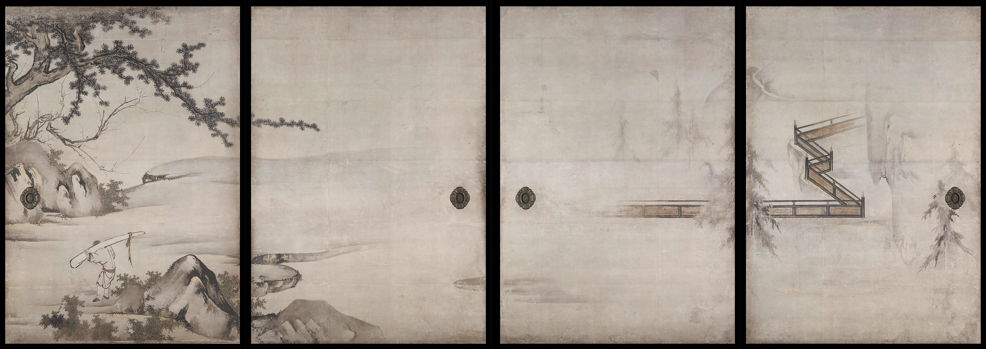 These ten panels, which decorate the Ehatsu-no-ma room (the upper first room), are among the 50 sliding panels of the abbot‘s chambers of Kenninji Temple painted by Kaiho Yusho, who was involved in a revival of Kenninji Temple in the early modern era. Only this work is colored; nevertheless, it creates a quite different impression than the realistically colored pictures of the Kano school, as it has the flavor of an ink-and-wash painting. Yusho‘s style was initially influenced by the Kano school. Later, he departed from the Kano school style by introducing the styles of Gyokukan and Ryokai, eventually establishing his own style. The composition of this work gathers the objects related to the main theme in the center of the painting, leaving broad empty space on both sides of the long screen; this is not typical of the Kano school style and reflects his enthusiasm for his work.