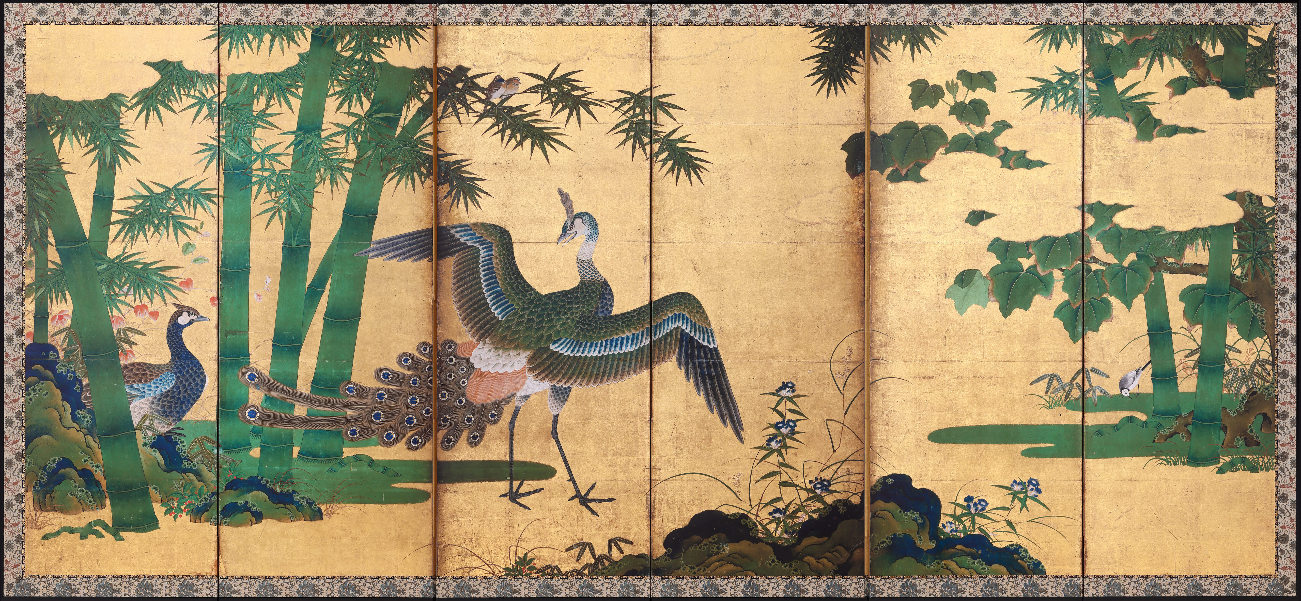 A splendid and luxurious pair of six-panel folding screens with a golden background, featuring phoenixes on the right screen and peafowl on the left, set against a backdrop of paulownia trees and bamboo. In ancient China, the phoenix was believed to dwell in the blue paulownia tree and feed on bamboo, with its appearance venerated as portending the birth of an excellent ruler. The peafowl, known for eating poisonous snakes, was regarded as a bird imbued with spiritual power that wards off evil. The combination of the two was favored as a motif of good omens.
