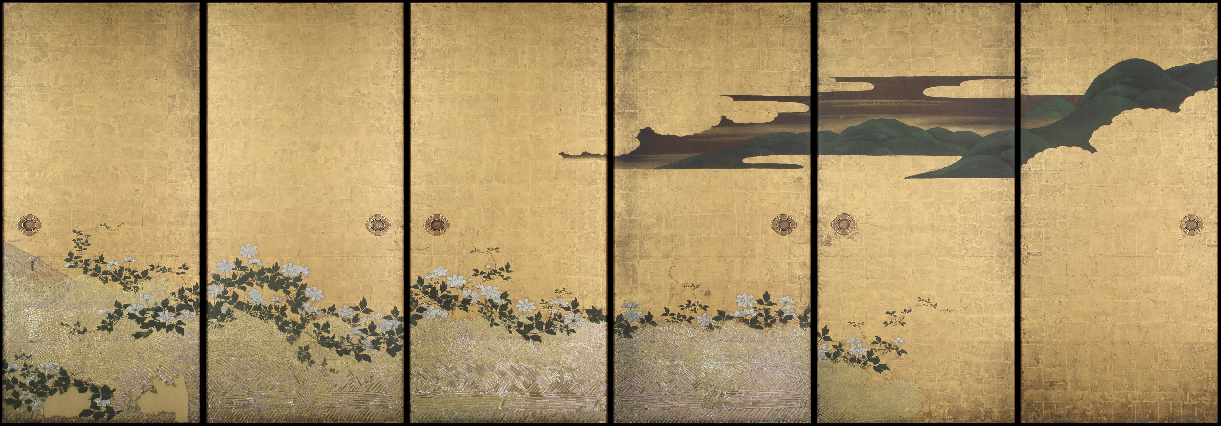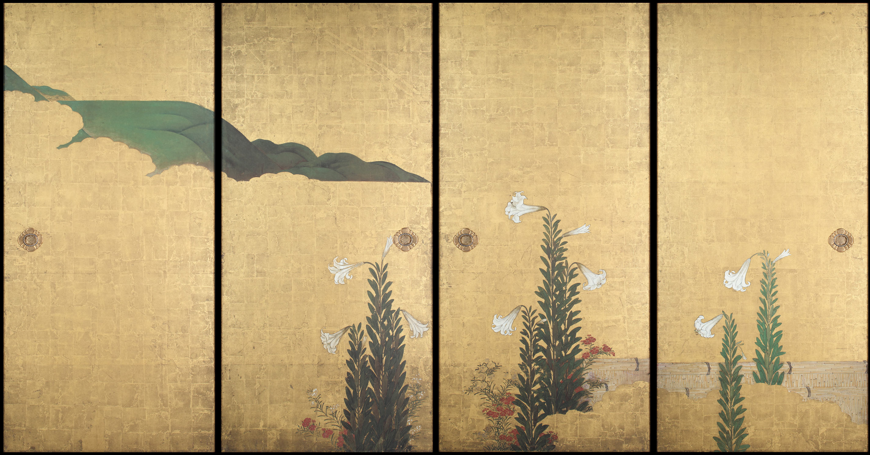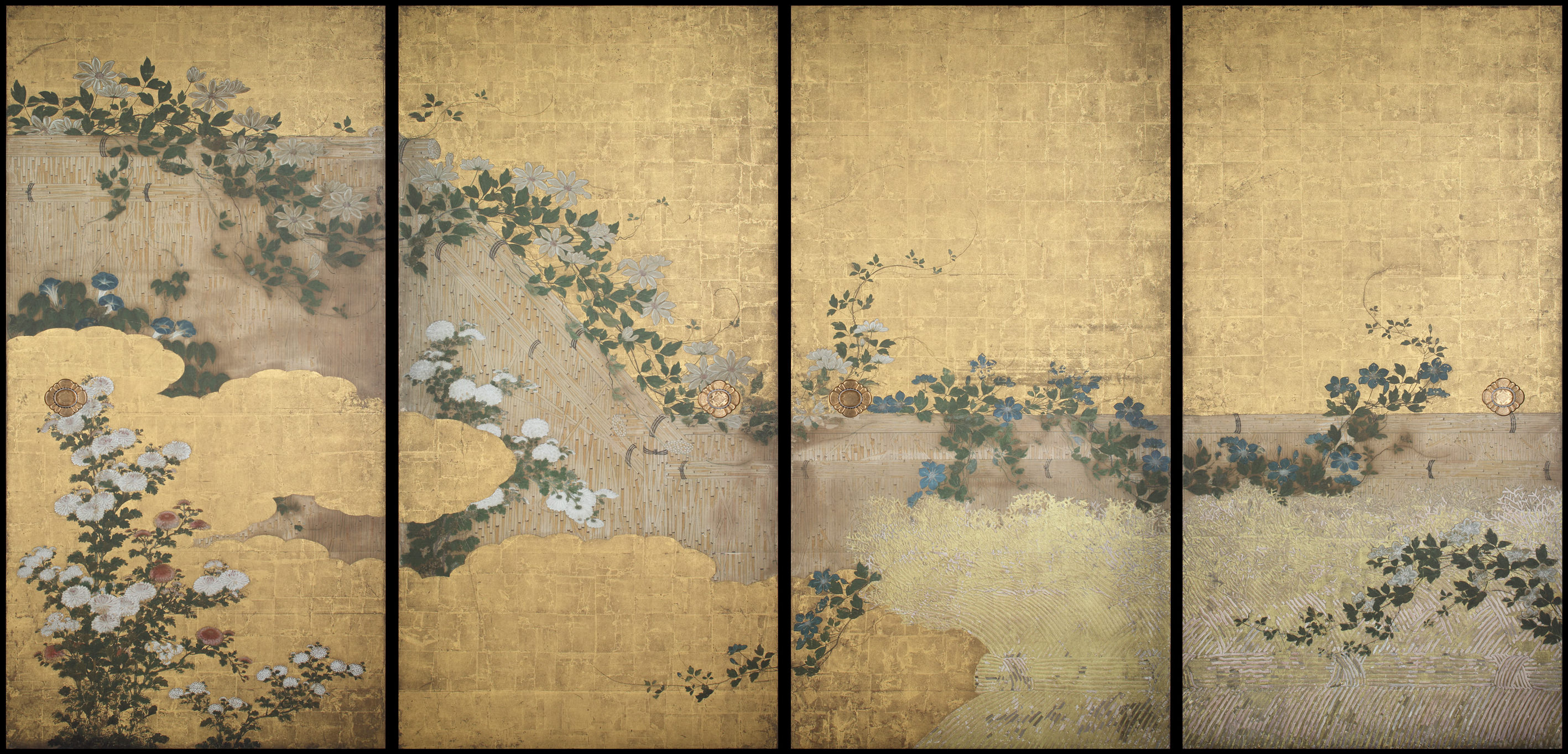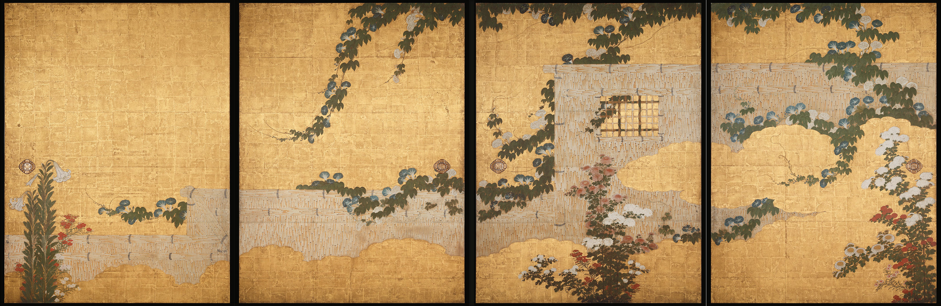 The lower second room of the abbot‘s chambers of Tenkyuin is commonly called Asagao-no-ma ("Morning glory room"). The paintings on all 18 sliding panels depict rough-hewn bamboo fences and flowers, creating a rhythmical curve. Blossoms of clematis florida and clematis patens are painted on the north side, with morning glories on the west side. Clematis patens, contrasted against the mountain in the background, are also painted on the south side, while white lilies are painted in sharp contrast with the gold background on the south side. All these paintings come together to make the whole room into an elegant, appealing, and fresh space.