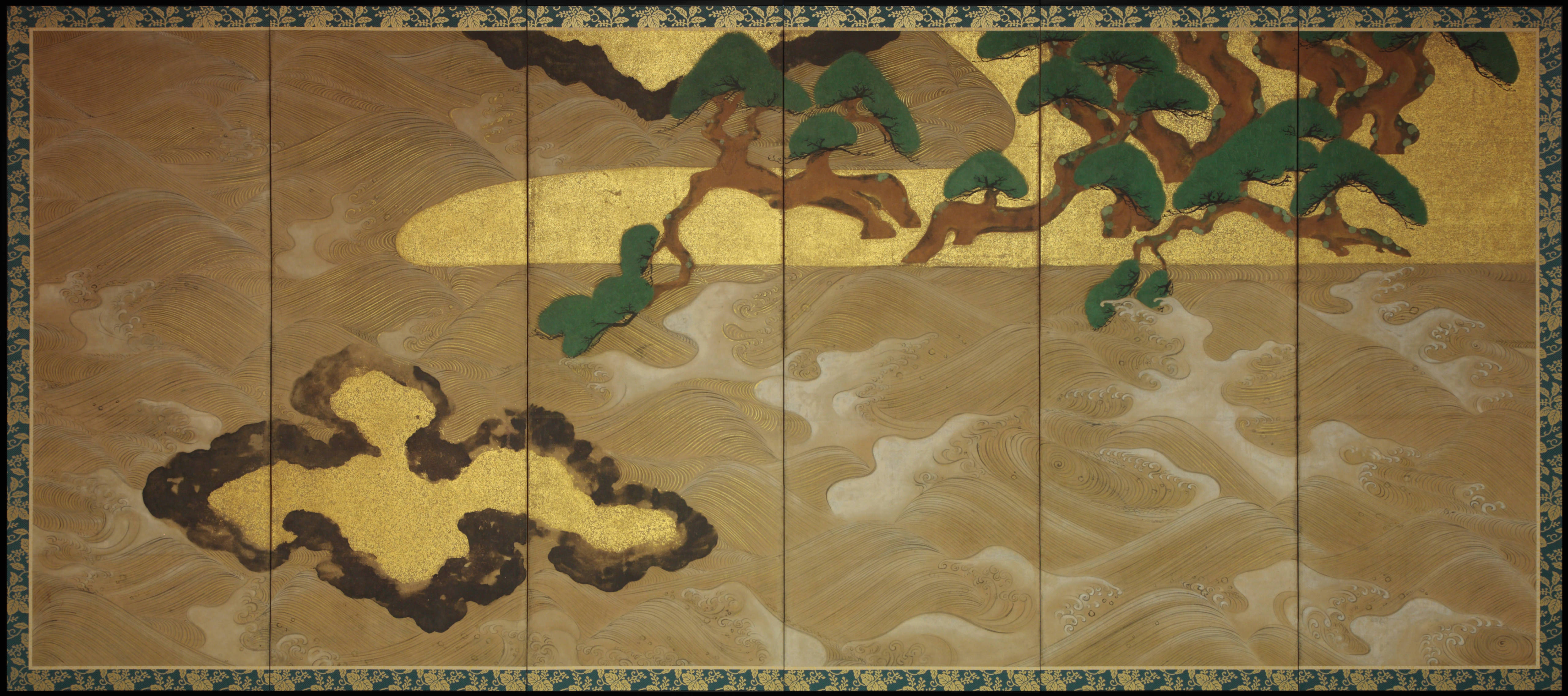 This work is by Tawaraya Sotatsu, founder of the Rimpa school. It is one of the six folding screens painted by Sotatsu still in existence. These screens are said to have been handed down to Shounji Temple in Sakai city, Osaka. Tani Shoan (1589 to 1644), a wealthy merchant, reputedly commissioned Sotatsu to make this painting, and later contributed it to the temple. The screens remained at Shounji until 1902, after which they became a part of the Charles Freer collection in the United States. This was sometime during the Meiji period. The right screen (shown below) shows sharp rocky reefs rendered in brilliant color, while the left screen shows pines growing on a sandy beach and a drifting cloud. Gold and ink are applied in layers to produce the dynamic effect of flowing waves.