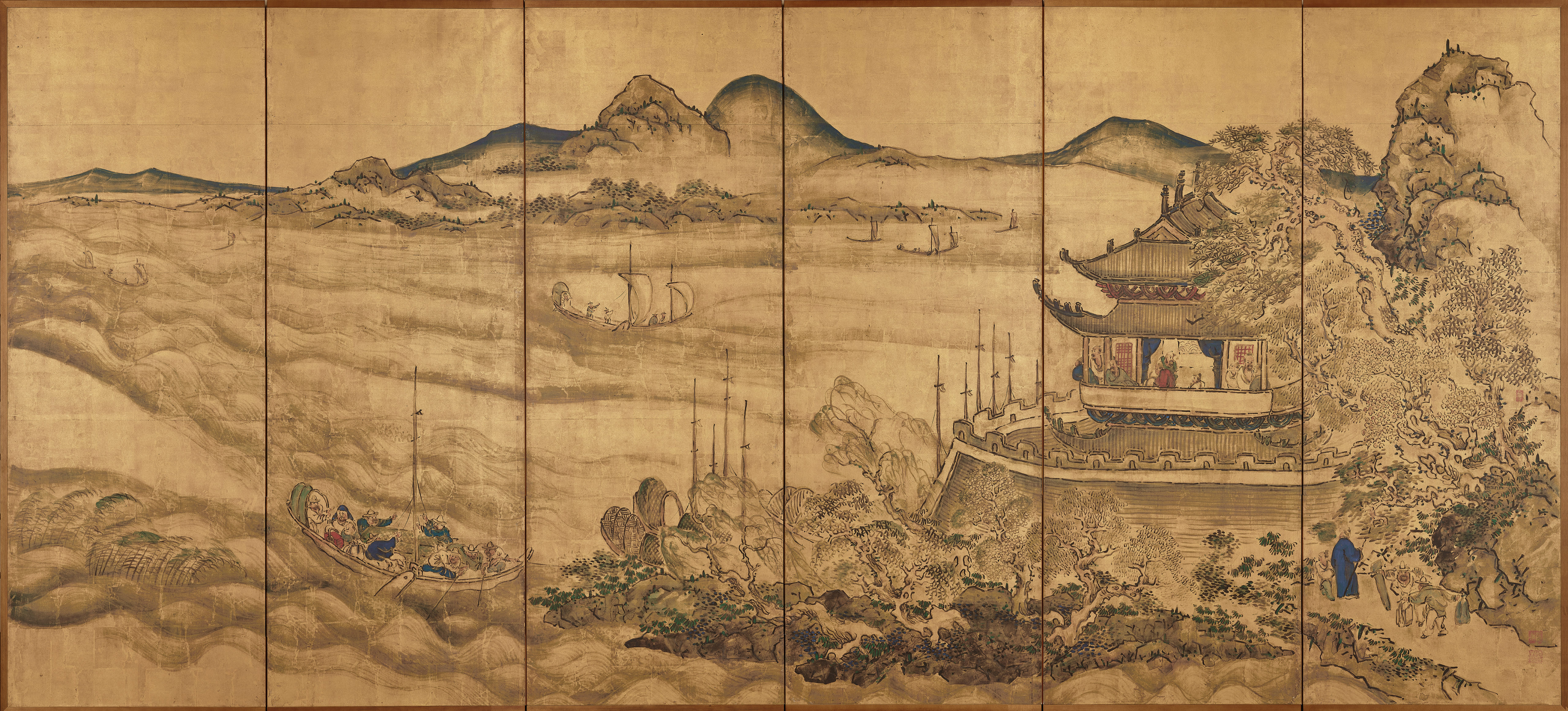 This pair of folding screens features two famous scenic areas in China. The right screen depicts Yueyang Pavilion, a building on the shore of Dongting Lake, while the left screen shows Zuiweng pavilion, located in the mountains of Anhui province. These are based on two scenes from an album of paintings from Qing dynasty China, which began in 1644 and ended in 1912. Several people have gathered at the top of these buildings to stand amongst the stunning nature and enjoy the tranquility. On a ground of gold foil, the artist had dynamically sketched scenes of nature using sumi ink and translucent pale green hues. This is complimented here and there by vivid ultramarine, vermillion, and verdigris tones. The painter, Ikeno Taiga, was active during the Edo period, which lasted from 1603 till 1868. Many painters at the time were drawn to modern Chinese culture. Taiga was one of these and his works were influenced by Nanshuga, a style of literati painting from Ming and Qing dynasty China, a period between the mid-14th to early 20th centuries. Though Taiga never travelled to China, this work of imagination is infused with his longings for the Middle Kingdom.