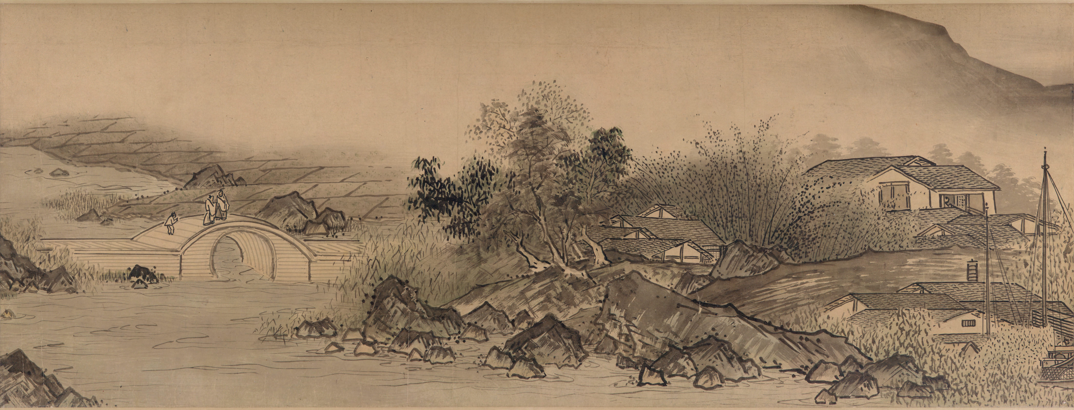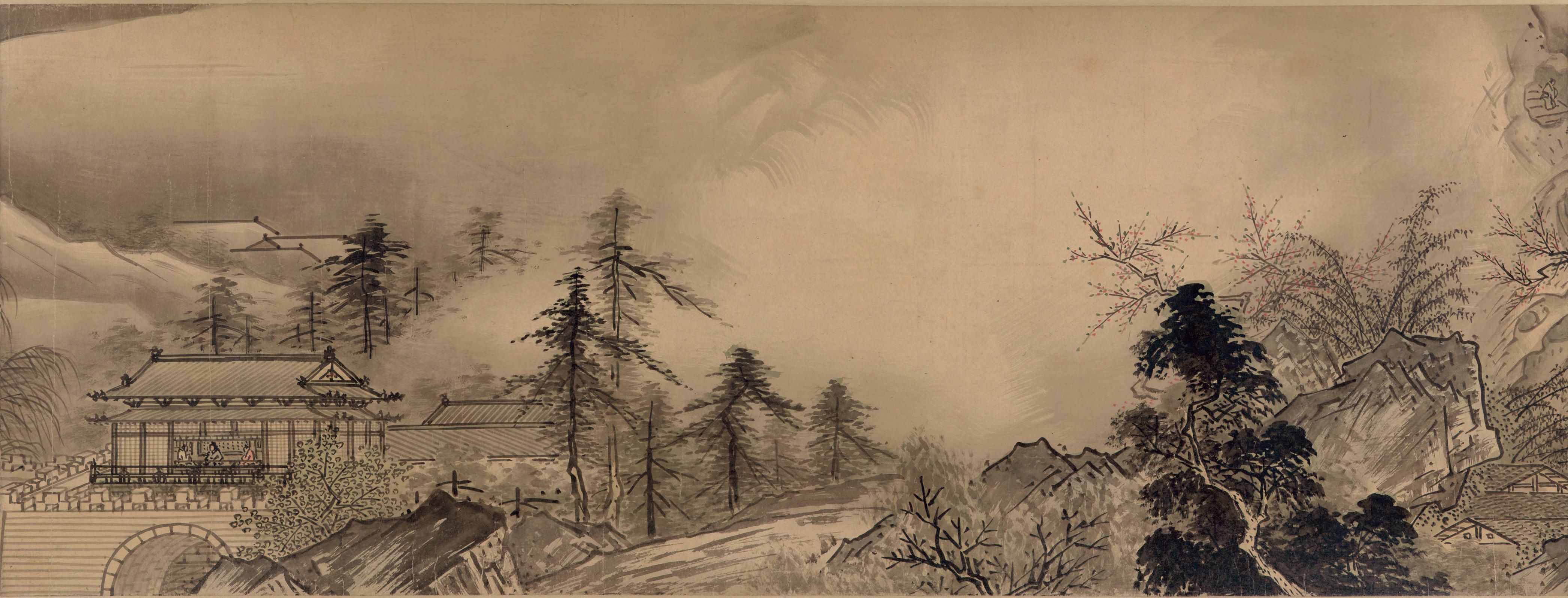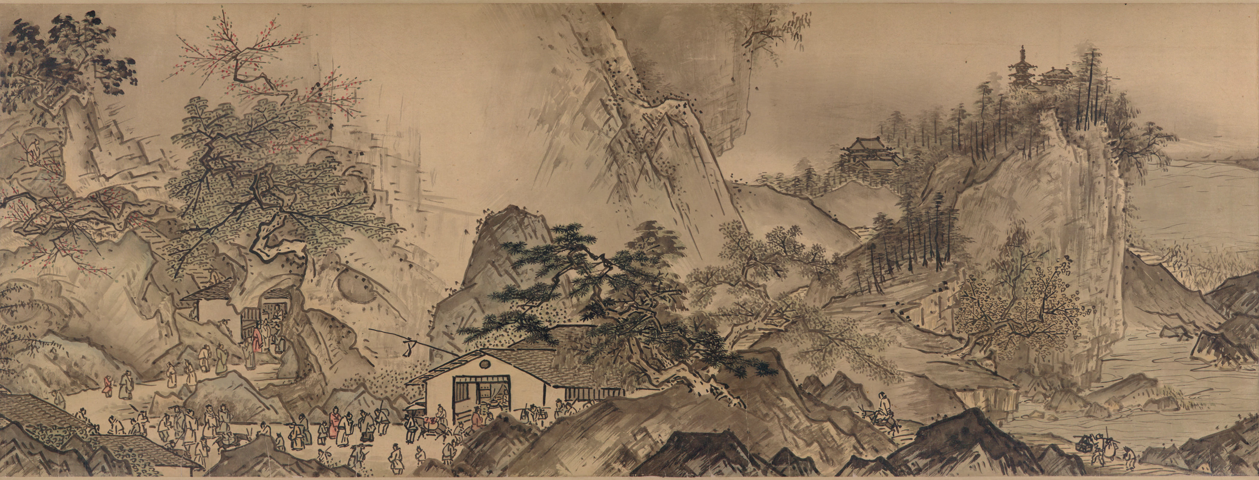 Sesshu (1420 to 1506) is said to have moved to the ancient capital when he was 10, where he entered Shoukokuji Temple and began studying under the great priest, Shurin Shuto and temple painter, Shubun. This ink and wash painting was supposedly presented to the Ouchi family, Sesshu's lifetime guardian. It is considered Sesshu‘s greatest work of art. The scroll, more than 15 meters long, draws upon his travels through China's vast nature land and various parts of Japan. Sesshu sought to reflect the beauty inherent in the nature of Japan by rendering the pavilions, pagodas, and people using Chinese strokes, and embracing that with a background of changing seasons using Japanese strokes.