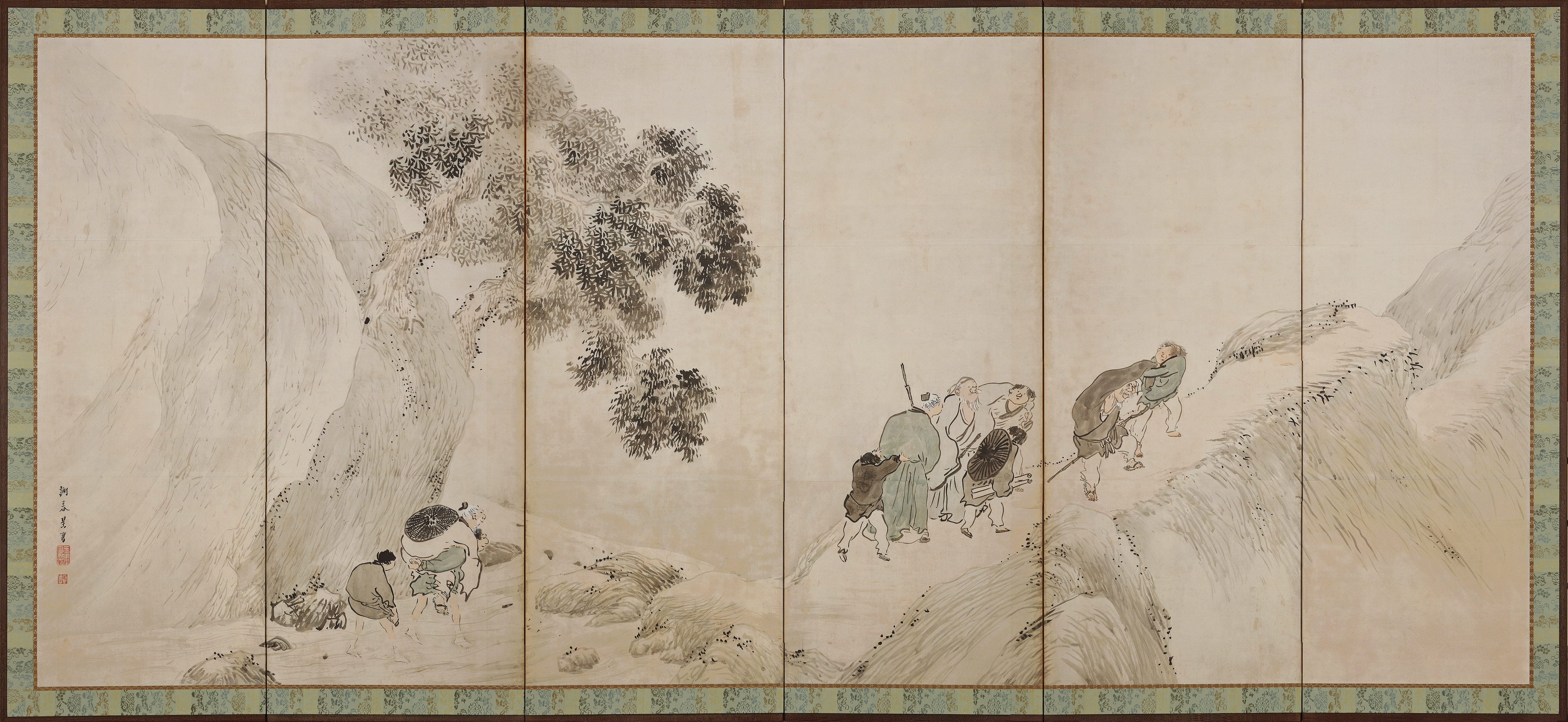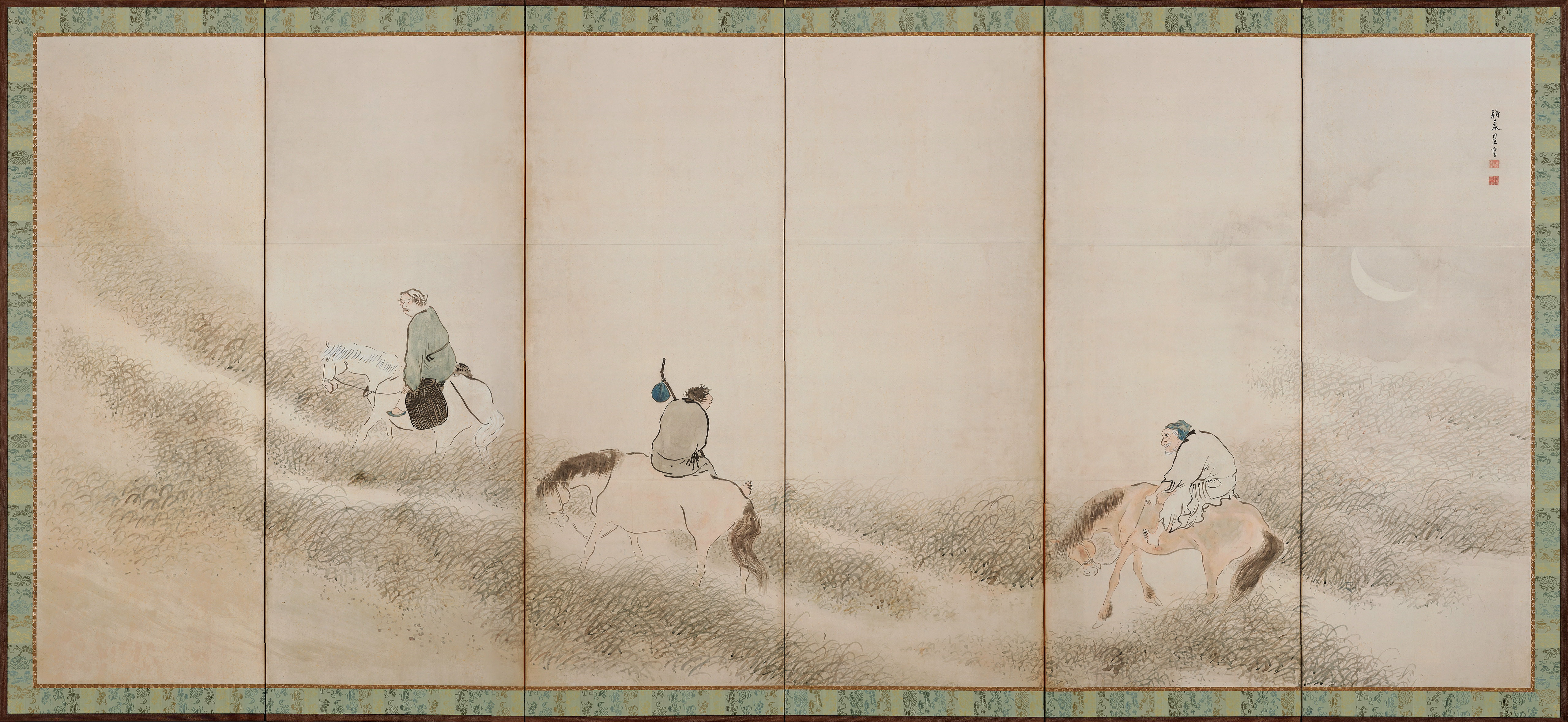 This set of two folding screens depicts travelers traversing rolling hills. The right-hand screen shows three men on horseback trotting along a moonlit path as dawn breaks. The left-hand screen features four old gentlemen crossing a stream and ascending a steep mountain with the aid of young servants. The scenery and human figures are portrayed using ink and light translucent colors. The viewer can almost sense the rustle of the wind and the freshness of the air. Yosa Buson was a poet and painter active in the latter half of the 18th century. He painted this work when he was in his late fifties. Buson started off as a writer of haiku poetry and he later began painting simple pictures to accompany his poems. In doing so, he created haiku pictures infused with a sense of individuality. Despite his success in the painting world, Buson never lost his love for poems and he incorporated the distinct charming lightness of poetry into his painted works. This picture has a Chinese theme, but the characters are portrayed in humorous fashion rather than as formal, eminent figures.