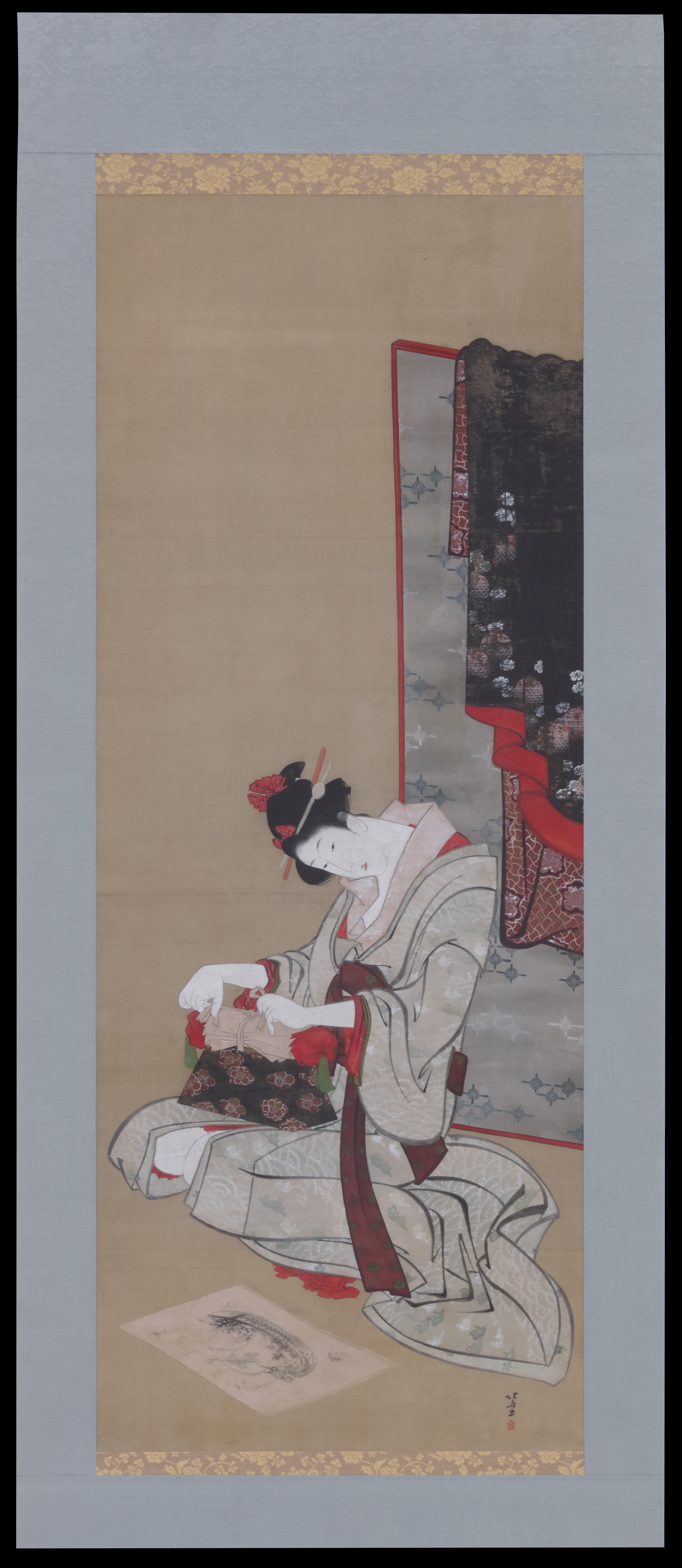 This work consists of a pair of panels, each depicting how women would greet a New Year. The right-hand panel shows a woman binding a picture of the Seven Gods of Good Fortune riding a treasure ship to her pillow in an attempt to make herself dream an auspicious first dream for the New Year. The left-hand panel shows how a woman collects fresh water in a lacquerware bowl and washes her face on the first morning of a New Year to rid herself of evil spirits for the new year. From the signature and seal applied to it, we presume that Hokusai produced it in his later forties. In 1903, it was exhibited for sale as part of a collection of fine art works offered by the Japanese fine art dealer Hayashi Tadamasa, who promoted the japonisme trend in Europe. Charles Lang Freer then purchased it through the art dealer Siegfried Bing, who similarly introduced Japanese fine arts to a wide range of people in Western countries.