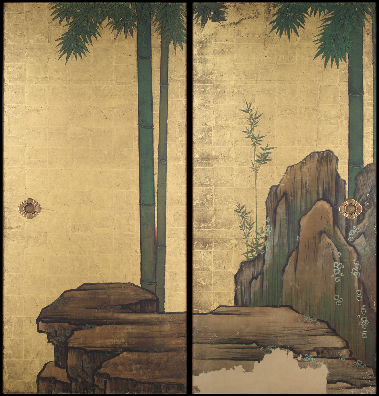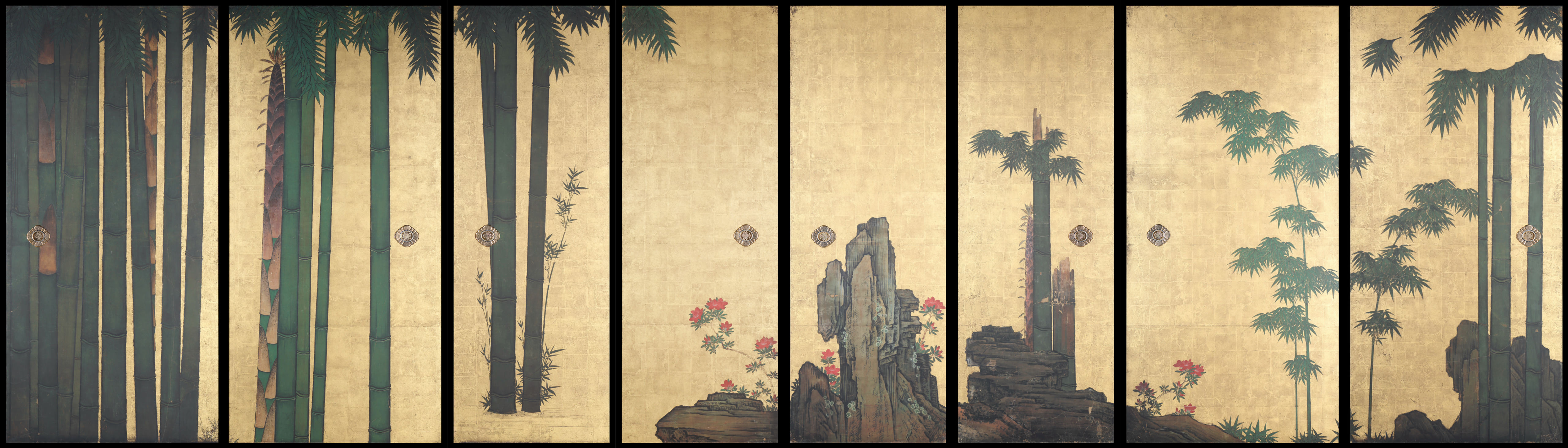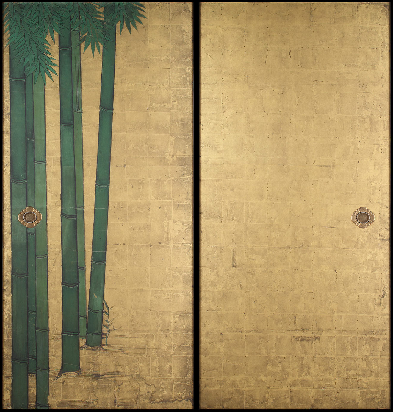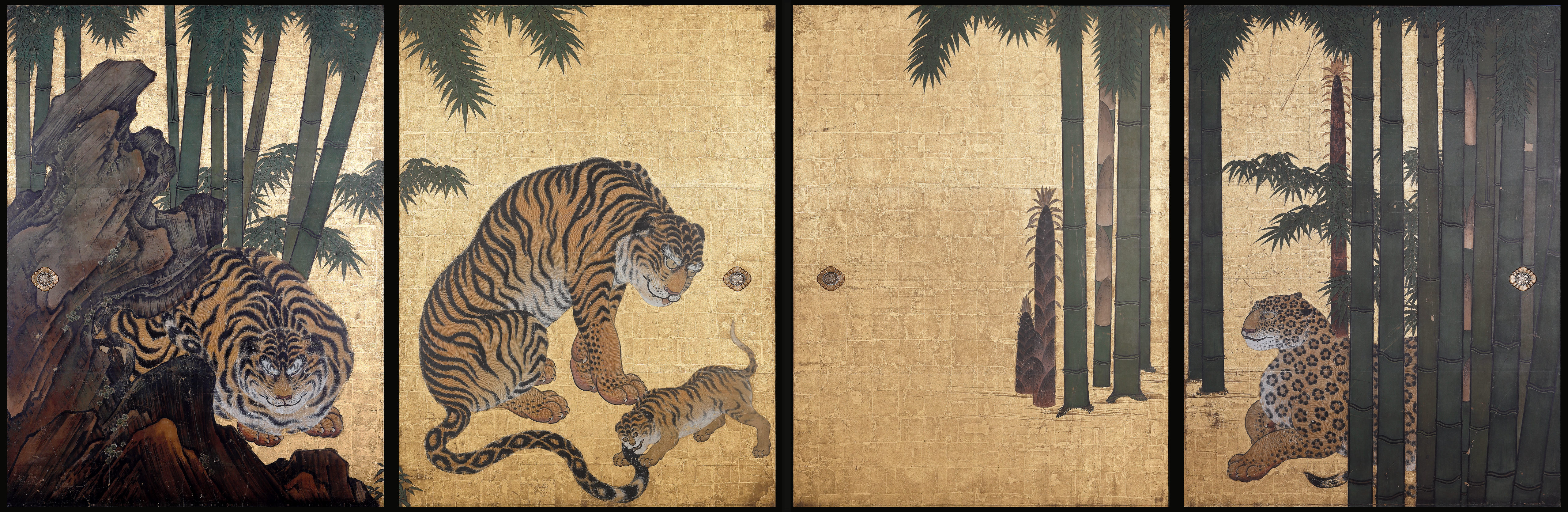 Tenkyuin, a subtemple of Myoshinji Temple, was erected by Tenkyuin, the third daughter of Ikeda Nobuteru, who served Oda Nobunaga and Toyotomi Hideyoshi. The painting on the sliding panels in the abbot‘s chambers of Tenkyuin was made when the subtemple was constructed. It is considered an extremely important historical work as well as a work of art. One of 152 painted sliding panels and cedar doors in the abbot‘s chambers, "Tiger and Bamboo" embellishes the chamber in which Buddhist services are held. "Tiger and Bamboo," which spans all 20 panels in the chambers, depicts tigers in various attitudes. Some are roaring heavenward, while the cubs fawn at their mother's tail. Fresh green bamboo and bamboo shoots, exquisitely arranged, attract the eye.