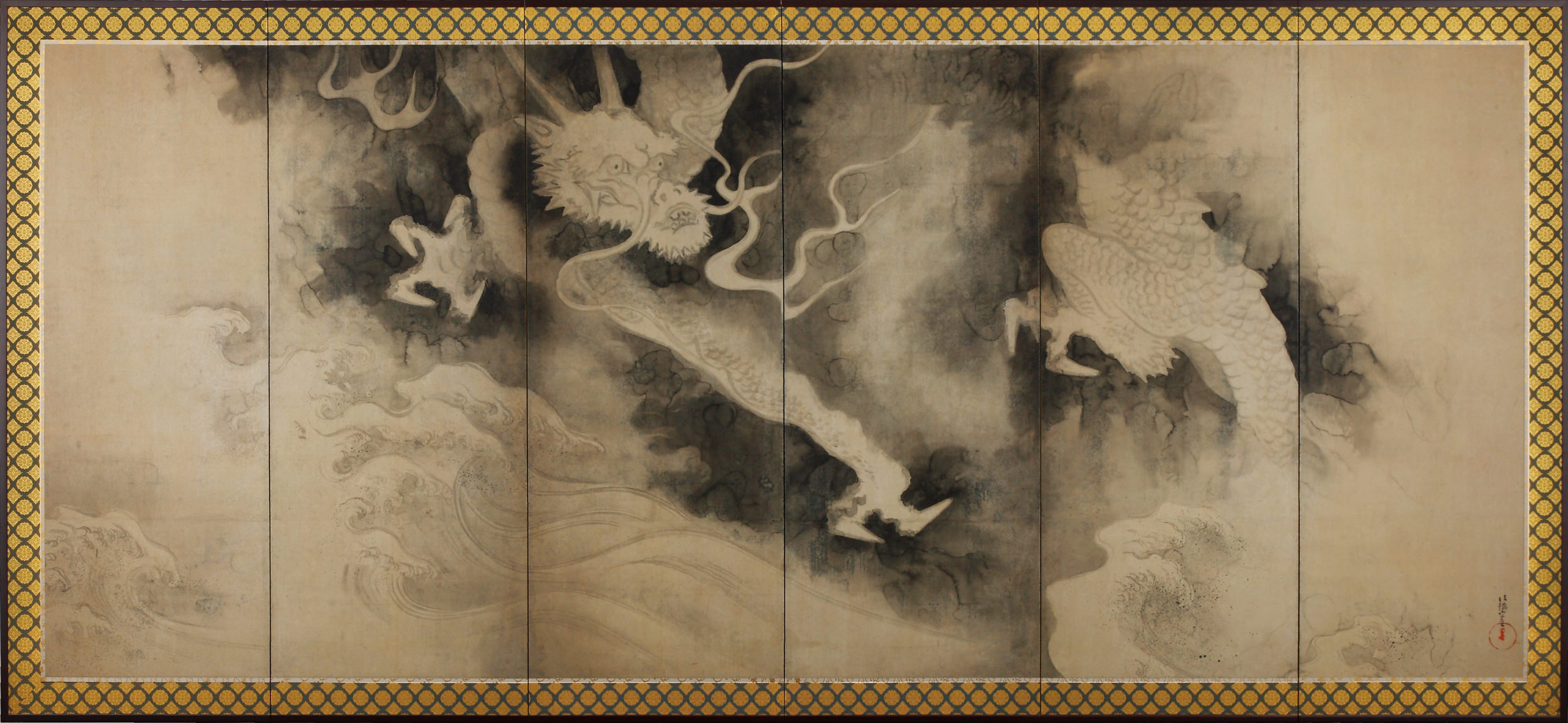 This rendition of the Dragon and Clouds features the signature "Hokkyo Sotatsu" and a seal bearing "Taichin". It is one of the few works of art recognized as an authentic painting by Sotatsu, and the only large-scale ink and water painting he ever did. The dragons on the left and right screens confront each other with one dragon rising above the clouds and waves, and the other dragon on its descent. The clouds are painted using a technique called "tarashikomi" whereby a second color is poured over the background. This sharpens the contrast of the clouds and creates visual depth. The artist, Sotatsu, operated a painting gallery in Kyoto called Tawaraya and was active in the early Edo era. Much about his life, including his date of birth and death remains unknown. It is believed that Sotatsu began working with sliding doors and screens in his later years, post 1620.