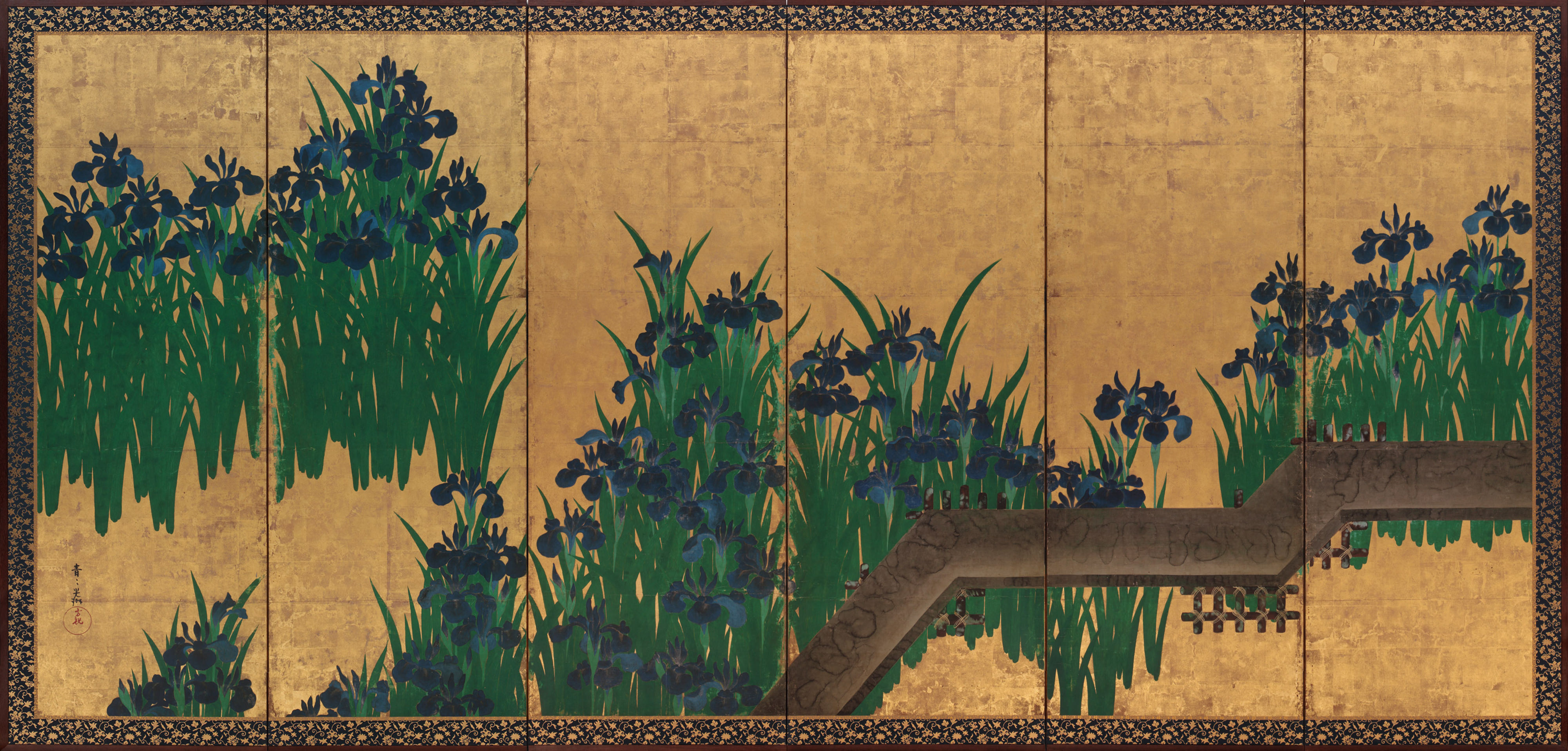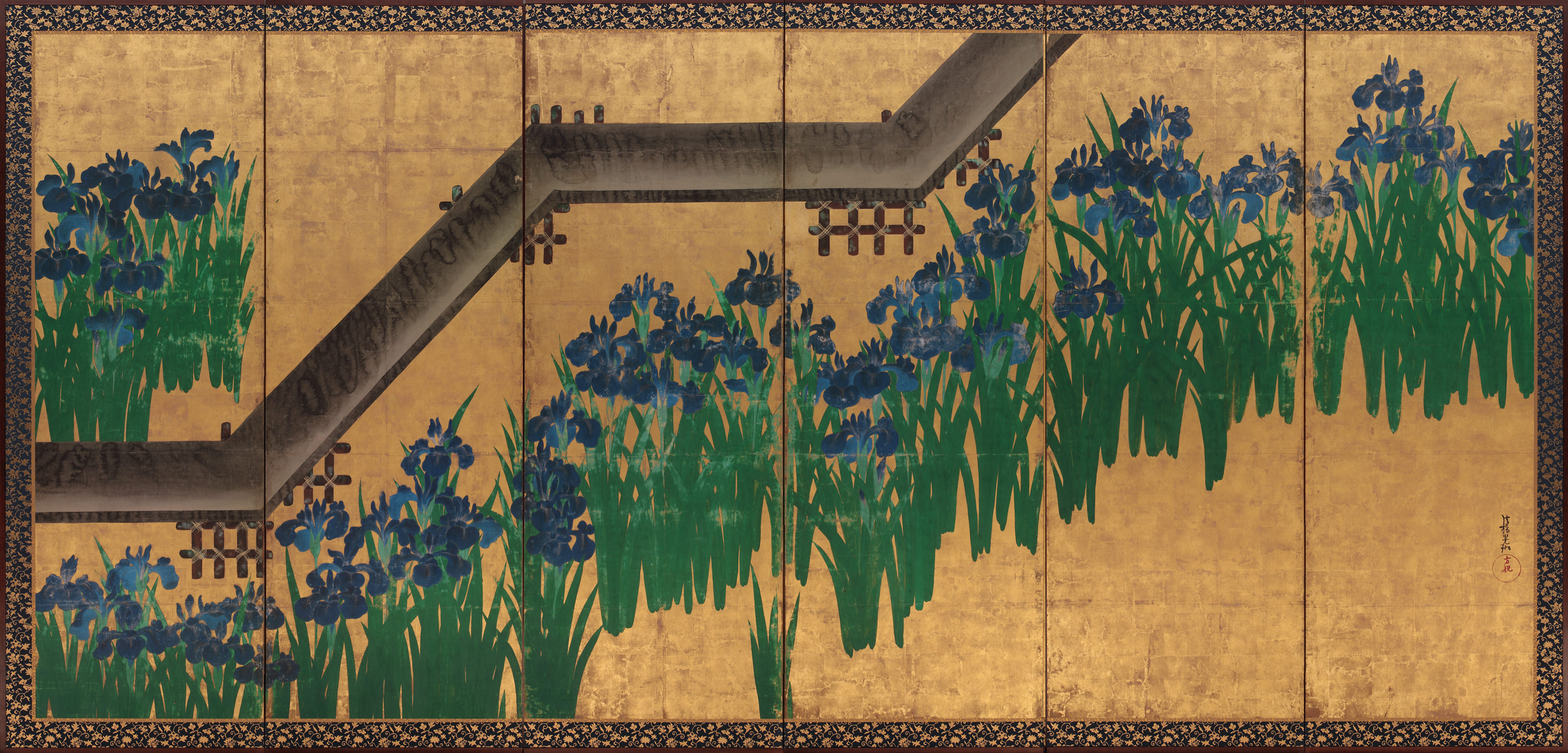 This folding screen is considered one of the best works of Korin, which, along with Waves at Matsushima, painted by Sotatsu (Freer Gallery of Art), are revered in the US as the two greatest works of the Rimpa school. The painting is gallantly bright, causing the patches of irises in green and purple and the paled black bridge to levitate off the gold background. The brilliant composition and contrasting colors captivate the viewer's senses at first sight. Sharp tensions are dramatized by the weaving path of bridge crossing through the rhythmically lined flowers. A technique called "tarashikomi" is heavily used to paint the bridge wherein a second color is poured over the undried first color. This lends a soft touch to the otherwise aggressive geometry of the bridge. Korin painted this work in his later years, a decade after painting Iris laevigata, now a National Treasure.