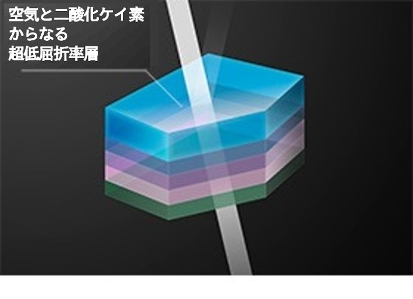 一方、ASC(Air Sphere Coating)は、レンズ表面の蒸着膜の上に、二酸化ケイ素と空気を含んだ膜を形成することで光の反射を抑制するコーティング技術です。光学ガラスよりも屈折率の低い空気をコーティング内に一定の割合で含ませることで、超低屈折率膜を形成。特に垂直に近い角度で入射する光に対して、高い反射防止効果を発揮し、フレア・ゴーストの発生を大幅に抑制することに成功しています。